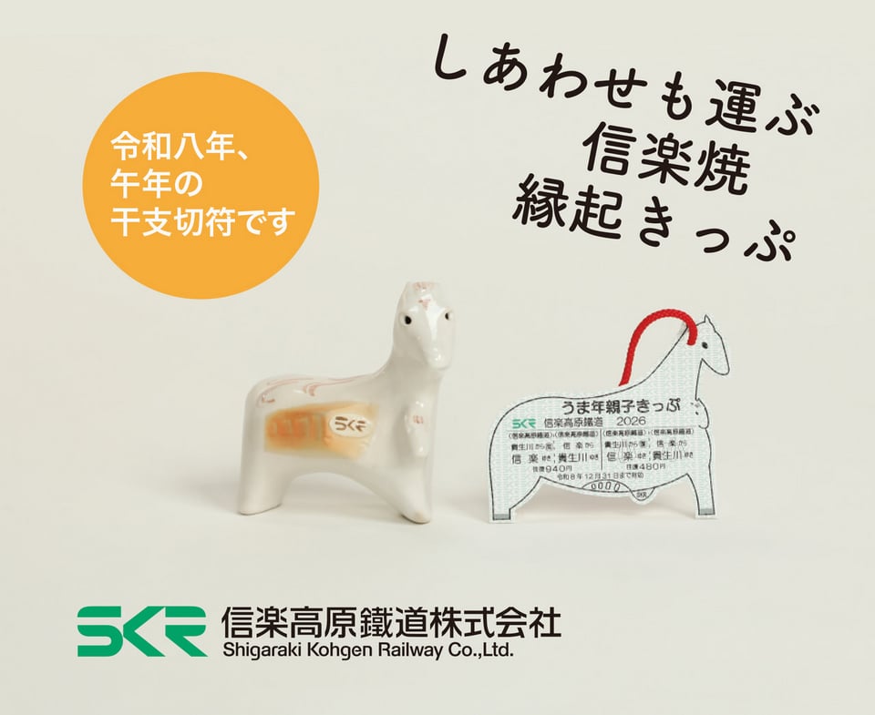 信楽高原鐵道オリジナルの、令和8年の干支「午」の置物と、大人1名小人1名の往復切符「うま年親子きっぷ」がセットになった干支切符を発売中です。手のひらサイズのかわいい午の置物と一緒に新しい年を迎えましょう。