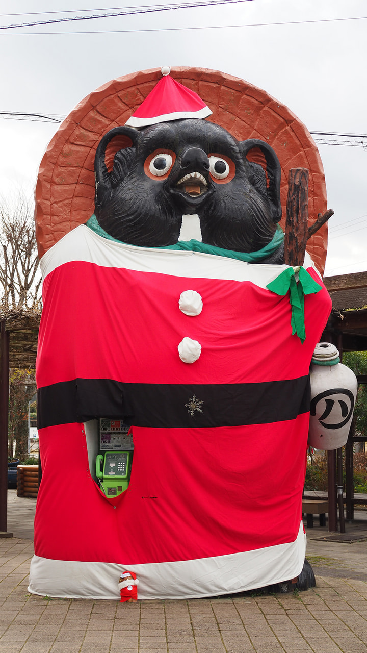 信楽駅前大たぬきがクリスマスのサンタ衣装でお出迎え中です。12月25日までお楽しみいただけます。 信楽へお越しの際はぜひ記念撮影をどうぞ! 大たぬきの着せ替え事業について
