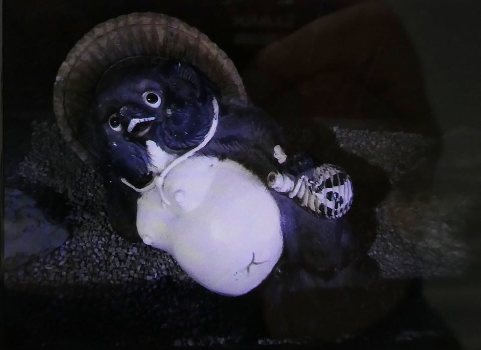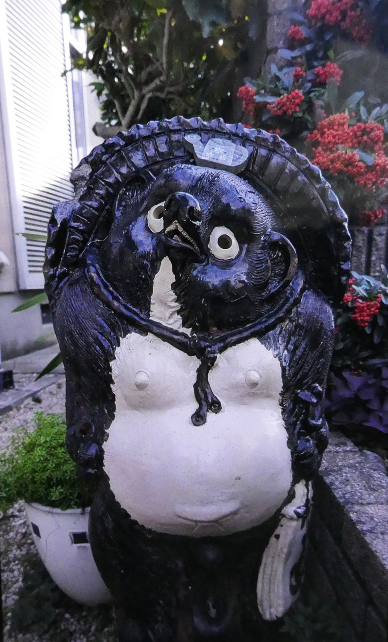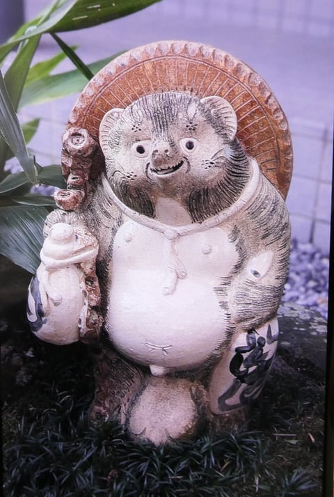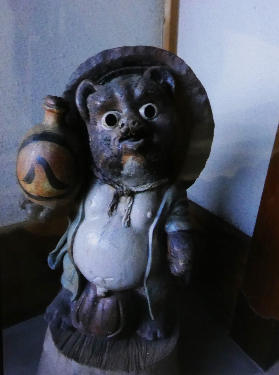 大きな古狸さん、よく見ると頭に何か乗っています。奥様作のトールペイントが飾られています!