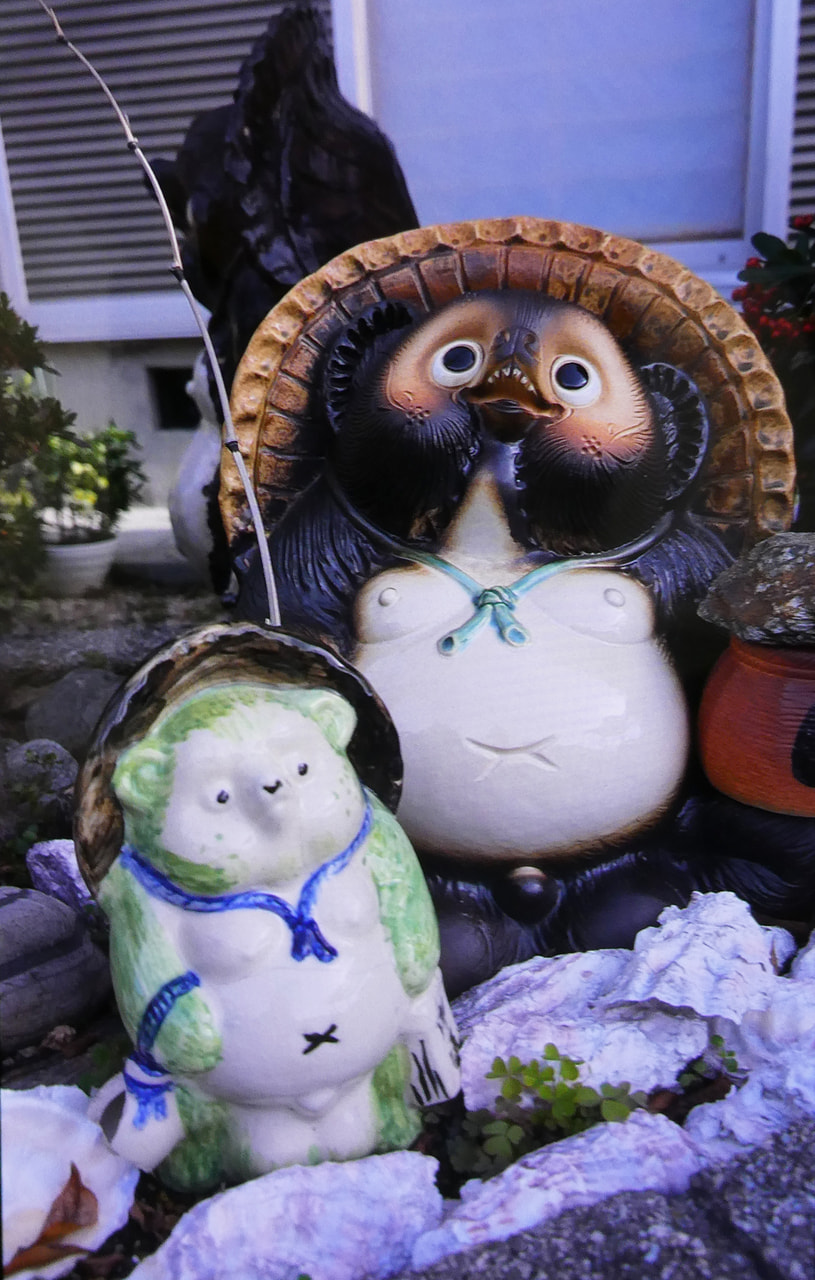 玄関先におかれるたぬきさん達。緑色の子はご自分で絵付けをされたもの。