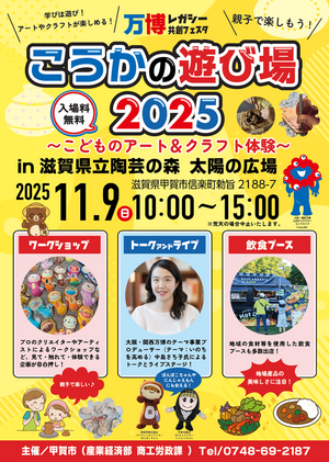 信楽焼産地として大阪・関西万博を振り返るとともに、子どもたちの「学び」につながるワークショップ等をおこないます。信楽たぬきの日(信楽町観光協会)ブースも出展。たぬきのカラーリングコンテストの体験や信楽のご紹介もおこないます。もちろん、ぽんぽこちゃんも遊びに来るよ!